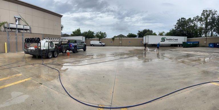Large retail facilities face unique exterior maintenance challenges. Dumpster enclosures, loading docks, parking areas, and entryways accumulate grease, dirt, and organic buildup that must be addressed without interrupting business operations.